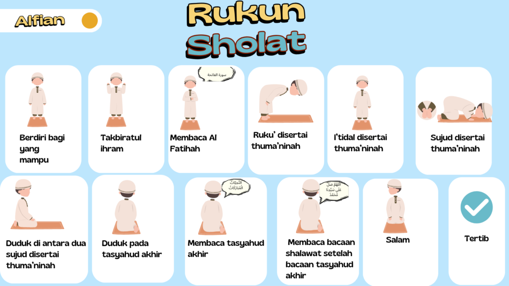 “This poster presents a visual mind map outlining the essential pillars of prayer (Rukun Salah) in Islam. It visually organizes each pillar in a clear and engaging way, starting from the intention (niyyah) to the final tasleem. Each section is color- coded and includes short explanations to help users quickly understand the key components of performing a valid prayer. The mind map format makes it easier to grasp the structure of prayer, aiding both beginners and those looking to strengthen their understanding of Islamic practices designed to be both educational and visually appealing.”