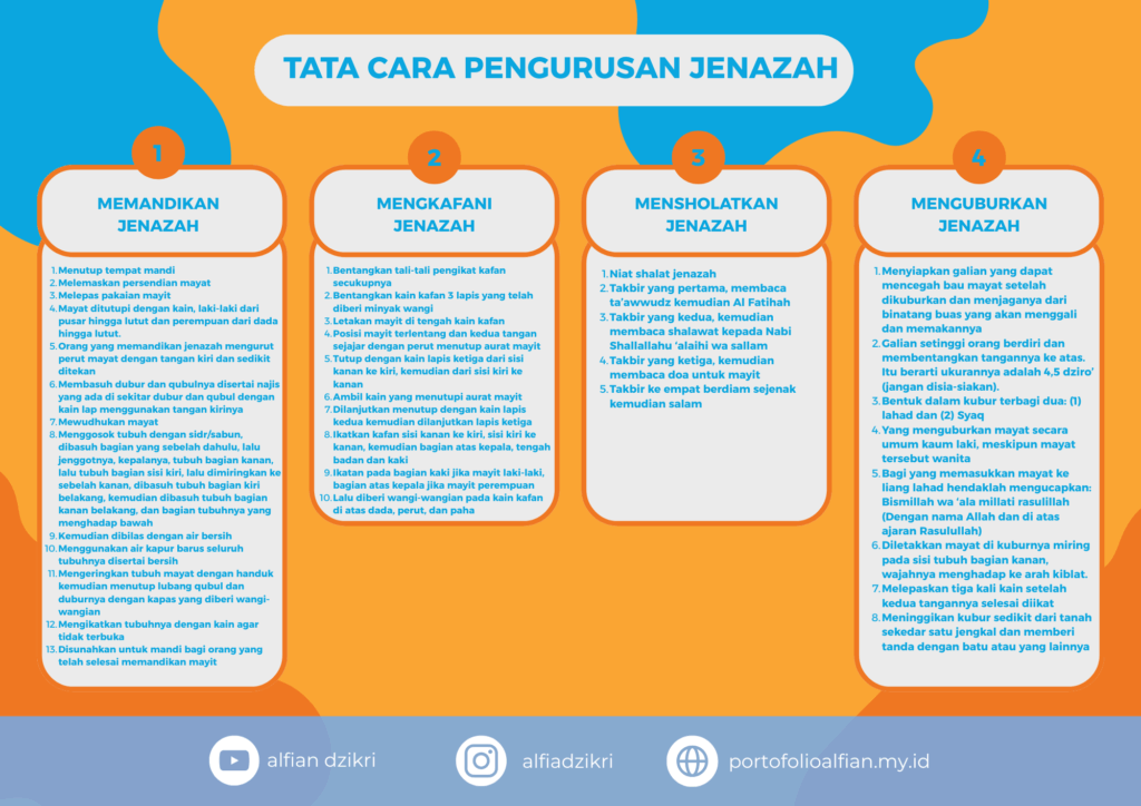 It shows four main steps: washing, shrouding, praying, and burying the body.