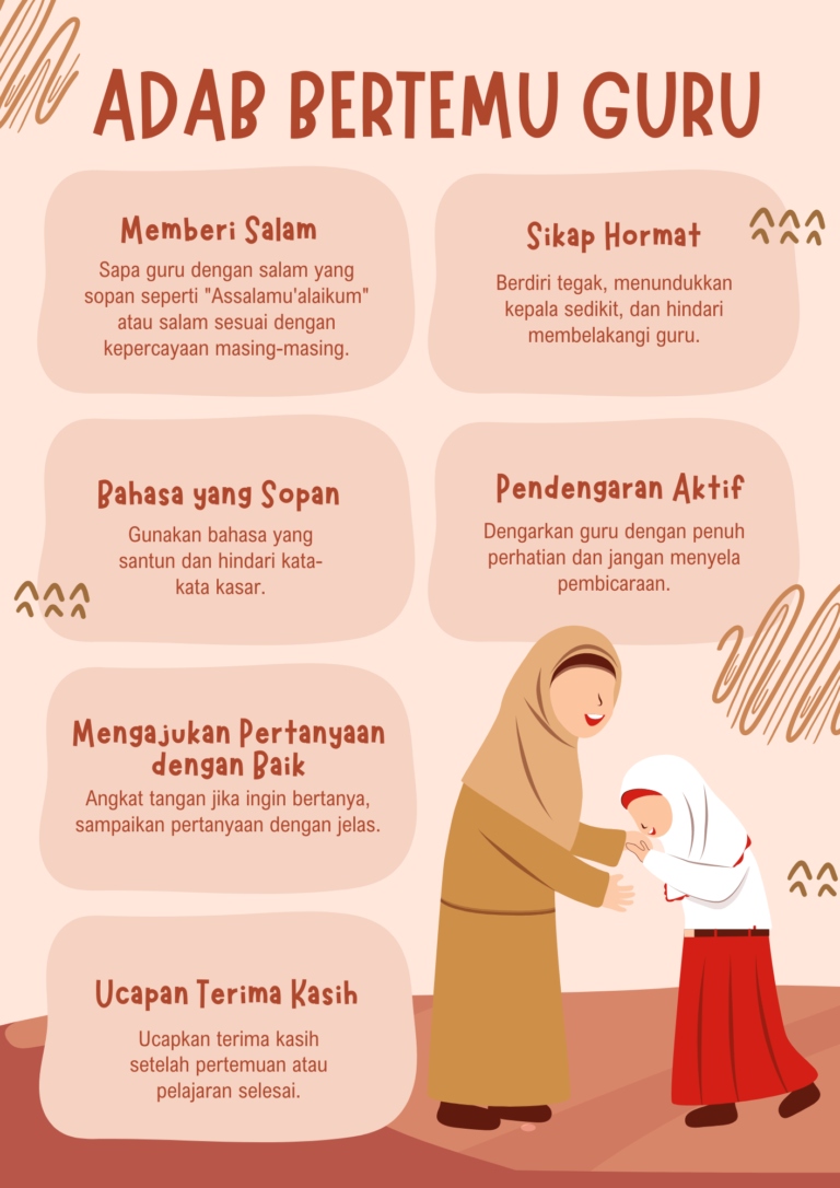 “This poster displays a guide on the etiquette of meeting teachers in Islam, reminding the importance of respect and politeness towards teachers. With attractive visuals, this poster includes points such as greeting first, listening attentively, not interrupting, and maintaining ethical dress. Each etiquette is explained briefly but clearly, supported by evidence from Islamic teachings and examples from the lives of scholars. This poster aims to instill the values of respect for teachers as a form of appreciation for knowledge.